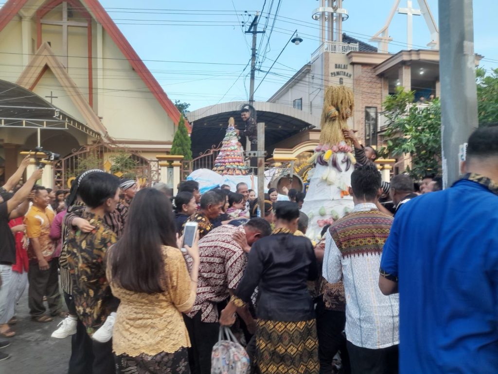 Sekitar 400 peserta dari berbagai usia membawa hasil bumi dalam tandu hias dan keranjang tradisional. Petugas Polsek Turi mengawal sepanjang rute, mengatur arus lalu lintas, serta berkoordinasi dengan tim keamanan internal gereja agar kegiatan berjalan lancar.