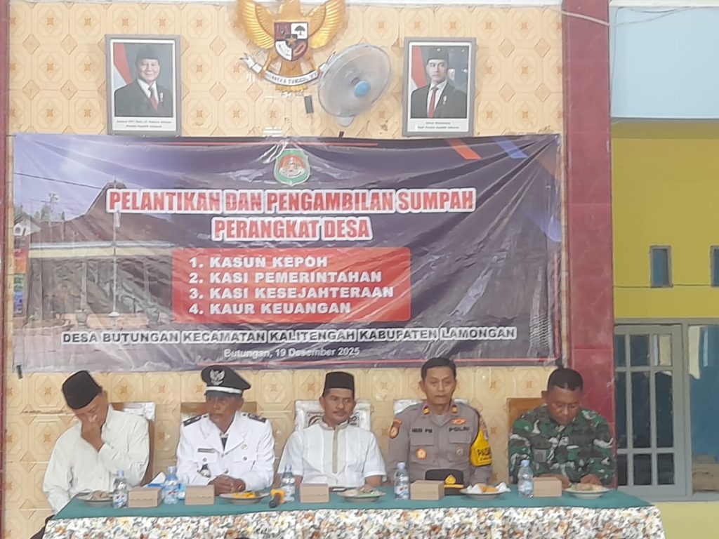 Analisajatim.id | Lamongan – Pemerintah Desa Butungan, Kecamatan Kalitengah, Kabupaten Lamongan, resmi melantik empat perangkat desa baru dalam prosesi pengambilan sumpah jabatan yang berlangsung khidmat di Balai Desa Butungan, Jumat (19/12/2025) siang.