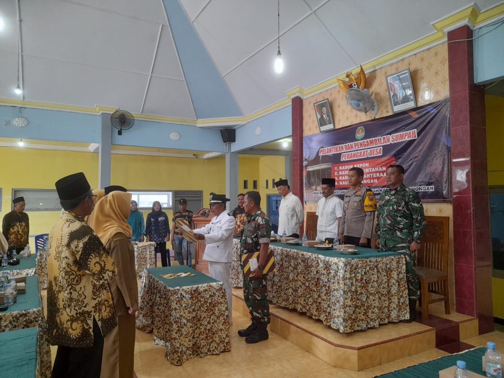 Rangkaian acara diawali dengan pembacaan SK Kepala Desa, dilanjutkan pengambilan sumpah jabatan, penandatanganan berita acara, serta penyerahan salinan SK kepada perangkat desa yang baru dilantik.