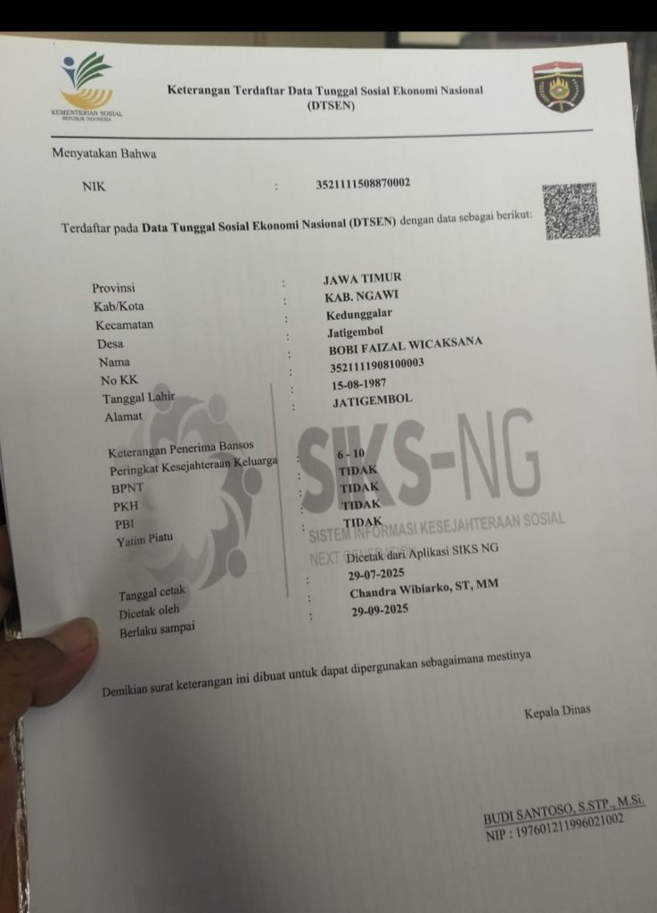 Selasa 11/11/25, kepala dinas sosial kabupaten Ngawi yang baru menjabat beberapa bulan, saat diwawancarai diruang kerjanya mengatakan bahwa bupati sudah punya rencana itu, ” kita setuju , sudah disiapkan dan segera dipasang, itu bagus untuk membuat terang apakah bantuan tepat sasaran atau tidak, kan kalau rumahnya bagus, motor ada beberapa, apalagi punya mobil, rumahnya ditempeli stiker keluarga miskin, pasti jadi malu, dan mungkin bisa mundur, namun itu juga ada kelemahan nya. Tingkat ekonomi orang itu bisa berubah – ubah, saat ini dipasang, beberapa saat bisa berubah jadi mampu, ” terangnya, sambil mengatakan bahwa sudah banyak penerima bantuan dicoret karena untuk judol.