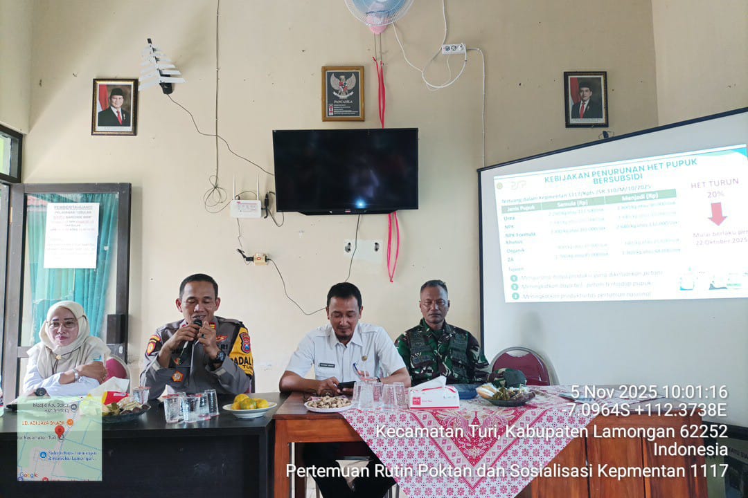 Analisajatim.id, Lamongan –Dalam upaya memperkuat sinergi antara aparat keamanan, pemerintah, dan kelompok tani di tingkat kecamatan, Kapolsek Turi, AKP Suroto, S.H., M.H., menghadiri kegiatan Pertemuan Rutin Kelompok Tani (Poktan) sekaligus Sosialisasi Keputusan Menteri Pertanian (Kepmentan) RI No. 1117 Tahun 2025 tentang Harga Eceran Tertinggi (HET) Pupuk Bersubsidi.
