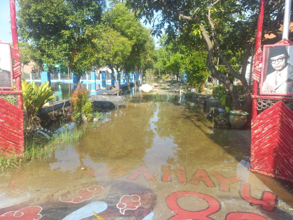 Jalan poros desa sepanjang ±1 km tergenang air setinggi 50 cm. Selain itu, 290 hektar tambak ikan, 70 rumah warga, serta sekolahan ikut terdampak.