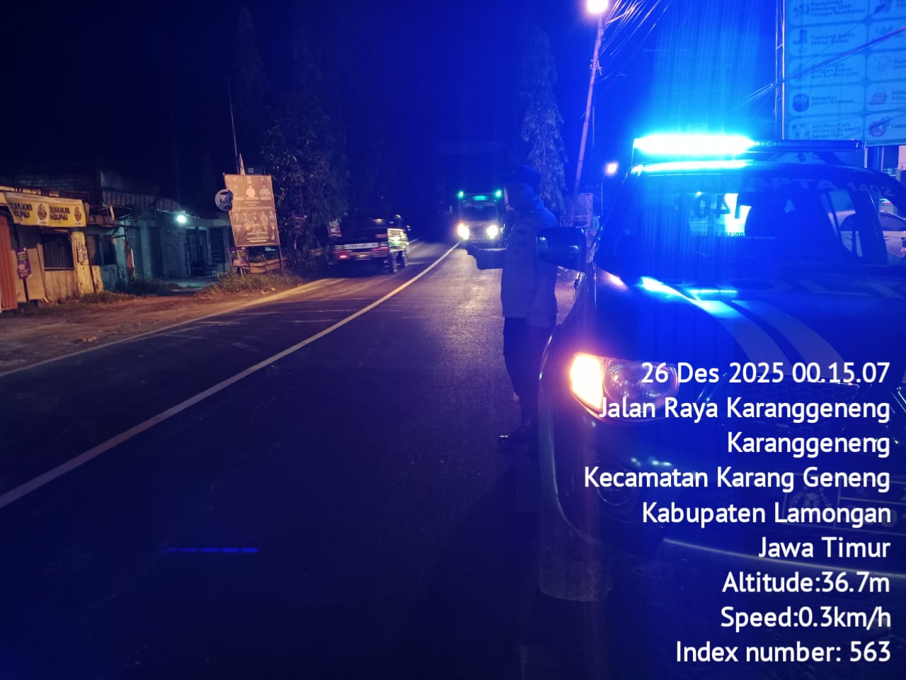 Guna menjaga situasi keamanan dan ketertiban masyarakat (Kamtibmas) tetap kondusif, Polsek Karanggeneng, Polres Lamongan, melaksanakan Patroli Blue Light di wilayah hukumnya, Jumat dini hari (26/12/2025).