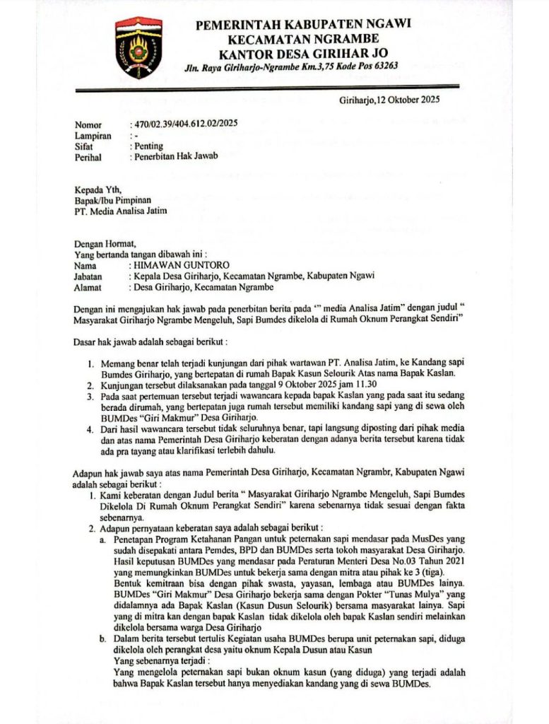 Ngawi, Analisajatim.id – Sesuai dengan amanat Undang-Undang Nomor 40 Tahun 1999 tentang Pers, pasal 5 ayat (2) yang memberikan hak kepada setiap pihak untuk menyampaikan hak jawab atas pemberitaan yang dianggap tidak tepat atau merugikan, redaksi Analisajatim.id memuat tanggapan resmi dari Pemerintah Desa Giriharjo, Kecamatan Ngrambe, Kabupaten Ngawi, Jawa Timur.
