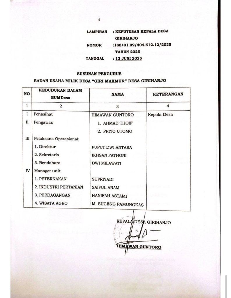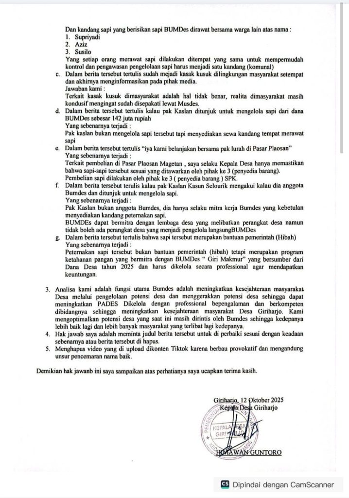 Hak jawab ini disampaikan oleh Pemerintah Desa Giriharjo melalui surat resmi bernomor 470/02.39/404.612.02/2025 tertanggal 12 Oktober 2025, dan ditandatangani oleh Kepala Desa Giriharjo, Himawan Guntoro.