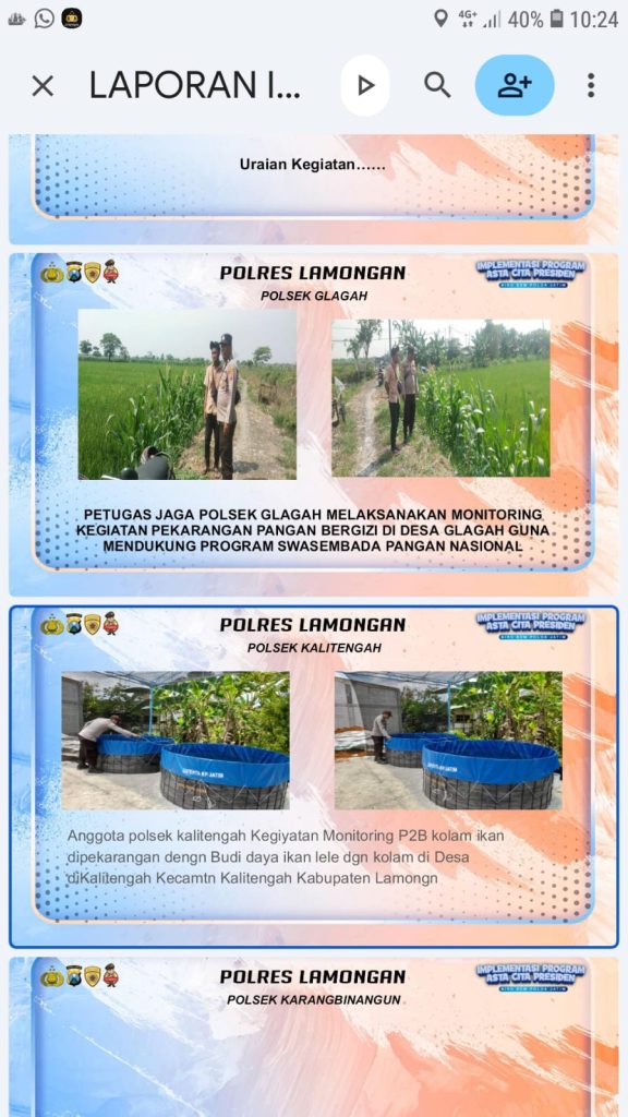Lamongan, Analisajatim.id — Dalam upaya mendukung program Asta Cita Presiden Republik Indonesia yang menekankan peningkatan ketahanan pangan dan pemberdayaan masyarakat, jajaran Polsek Kalitengah, Polres Lamongan, melaksanakan kegiatan patroli dan monitoring Program Pemanfaatan Pekarangan untuk Pangan Bergizi (P2B), Selasa (4/11/2025) sekitar pukul 10.26 WIB.