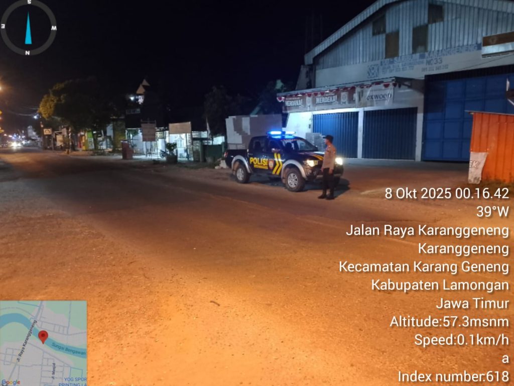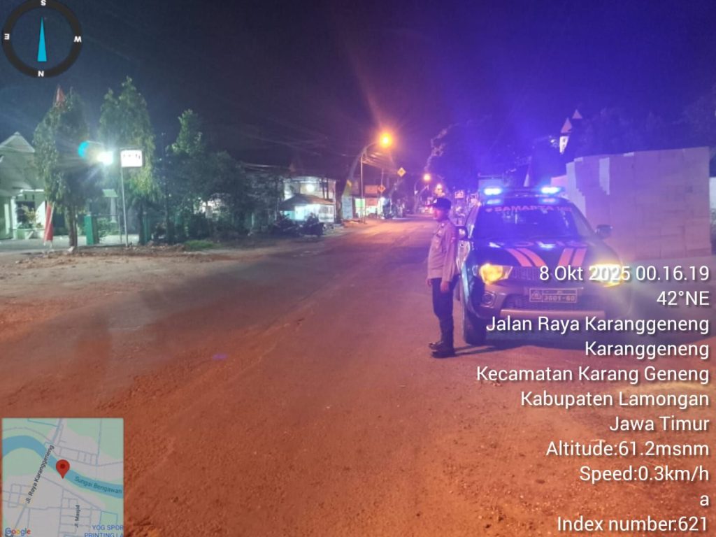 Dalam rangka menjaga situasi keamanan dan ketertiban masyarakat (Kamtibmas) tetap kondusif, Polsek Karanggeneng Polres Lamongan melaksanakan patroli Blue Light pada Rabu dini hari, 8 Oktober 2025. Kegiatan patroli dimulai pukul 00.10 WIB hingga selesai, dengan menyusuri jalan poros Karanggeneng–Sukodadi serta sejumlah lokasi yang dinilai rawan gangguan Kamtibmas.