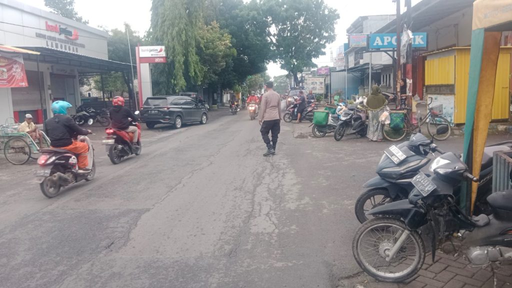 Aipda Achmad Zainuri, A., bersama Briptu Dedy Setiawan, S.H., mengatur lalu lintas serta mengamankan masyarakat yang menyeberang jalan dan kendaraan roda dua maupun roda empat yang melintas di kawasan pasar yang mulai ramai sejak subuh.