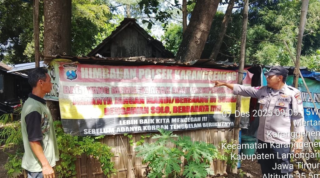 Analisajatim.id | Lamongan, — Untuk mengantisipasi potensi korban tenggelam di aliran Bengawan Solo, Polsek Karanggeneng melaksanakan patroli sekaligus pemasangan banner imbauan larangan mandi di sungai pada Minggu pagi (7/12/2025) sekitar pukul 09.00 WIB.