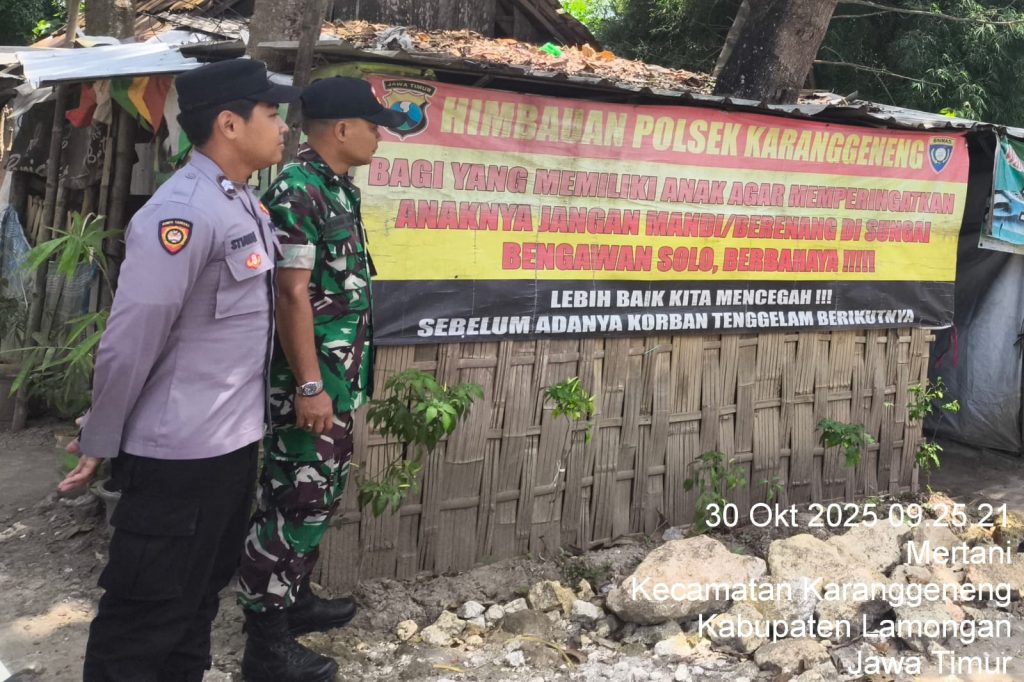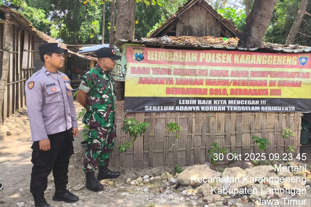 Lamongan, AnalisaJatim.id – Sebagai langkah preventif untuk mencegah terjadinya kecelakaan di perairan, Polsek Karanggeneng melaksanakan kegiatan pemasangan spanduk imbauan keselamatan di area Bengawan Solo, Desa Mertani, Kecamatan Karanggeneng, pada Kamis (30/10/2025) pukul 09.00 WIB hingga selesai.