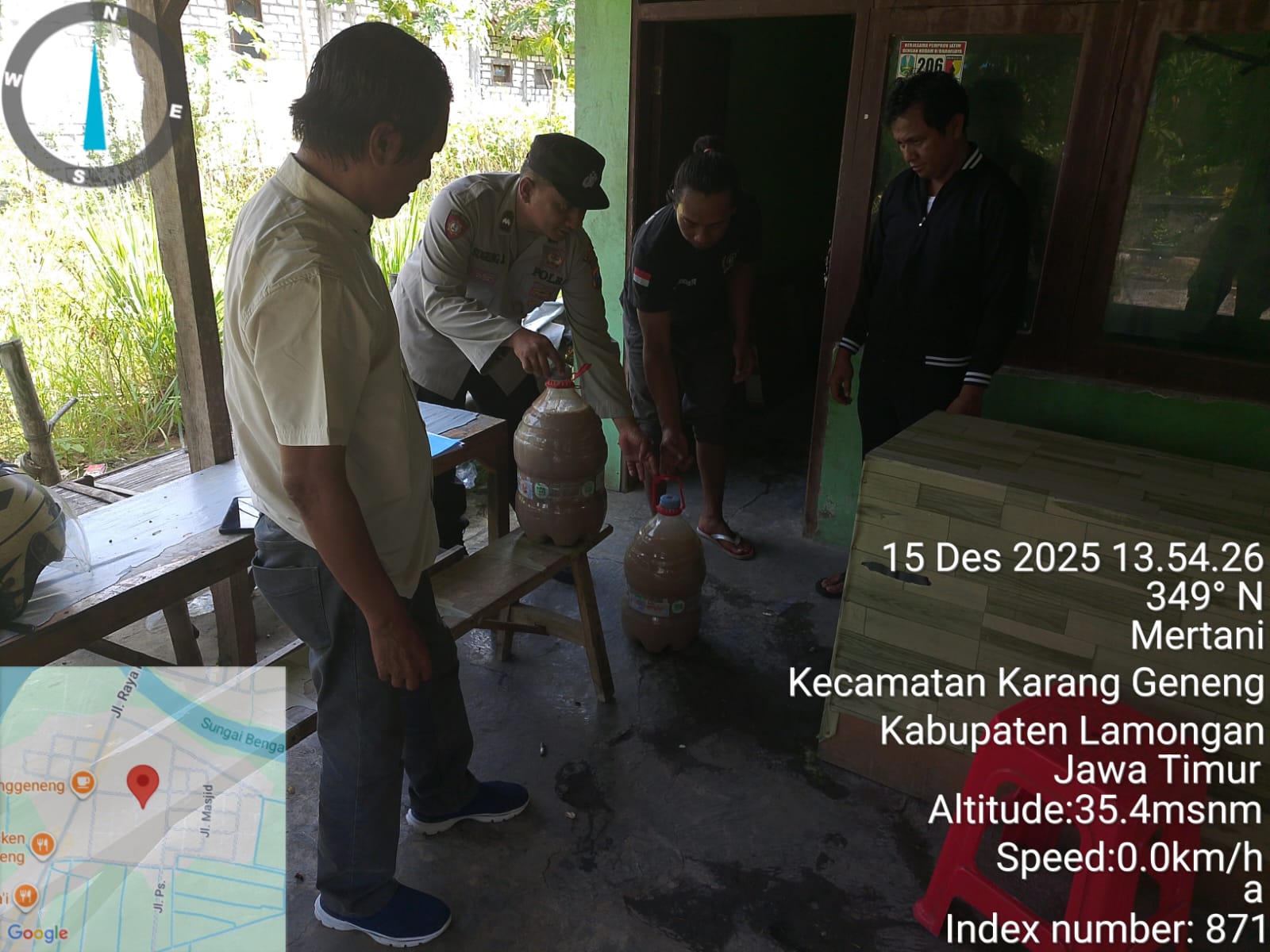 Analisajatim.id | Lamongan – Komitmen Polsek Karanggeneng dalam menegakkan Peraturan Daerah terus dibuktikan. Jajaran Polsek Karanggeneng berhasil mengamankan minuman keras (miras) jenis arak/toak dari sebuah warung di Desa Mertani, Kecamatan Karanggeneng, Kabupaten Lamongan, Senin (15/12/2025).