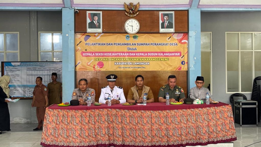 Analisajatim.id | Lamongan, — Pemerintah Desa Kalanganyar, Kecamatan Karanggeneng, resmi melantik dan mengambil sumpah jabatan dua perangkat desa baru pada Selasa (09/12/2025) sekitar pukul 09.25 WIB di Balai Desa Kalanganyar. Acara yang dihadiri sekitar 100 undangan itu berlangsung khidmat, tertib, dan penuh apresiasi dari unsur pemerintahan kecamatan hingga tokoh masyarakat.