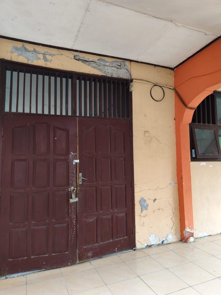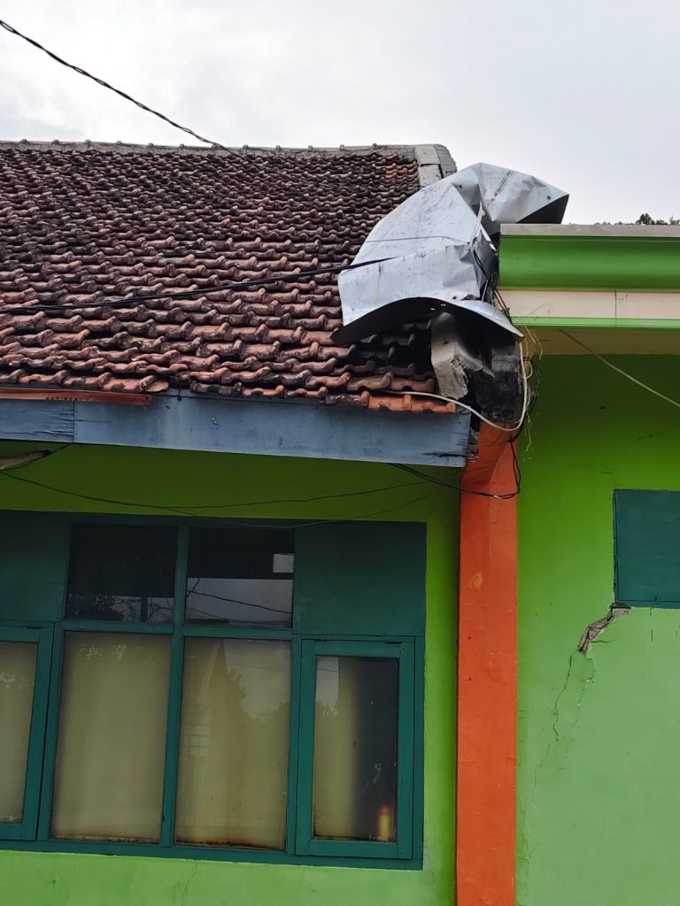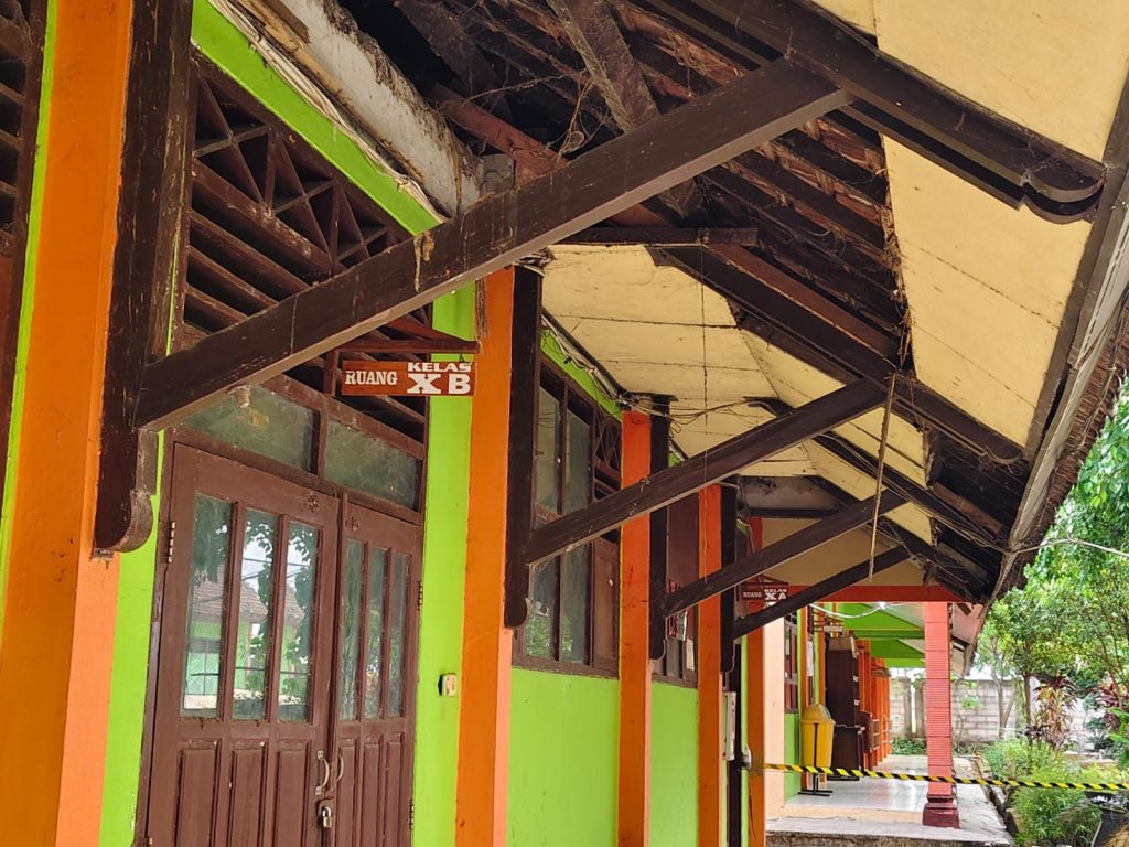 Kerusakan itu ada di ruang kelas bagian gedung depan, kelas 10 A, 10 B, dan gedung belakang, berupa atap jebol, tembok dinding retak – retak.